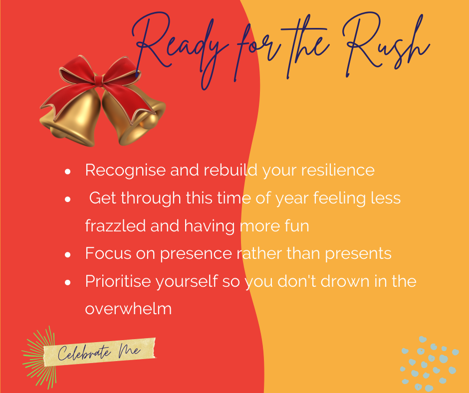 The end of the year can have you running in circles and exhausted, with no energy left to actually enjoy the festivities. Make it different this year., by recognising and rebuilding your resilience, setting boundaries and finding your joy.